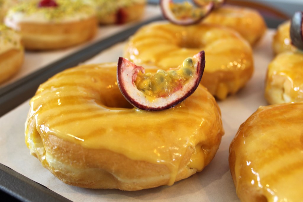 Donut mangue & passion: nappage mangue passion, fourré coulis passion