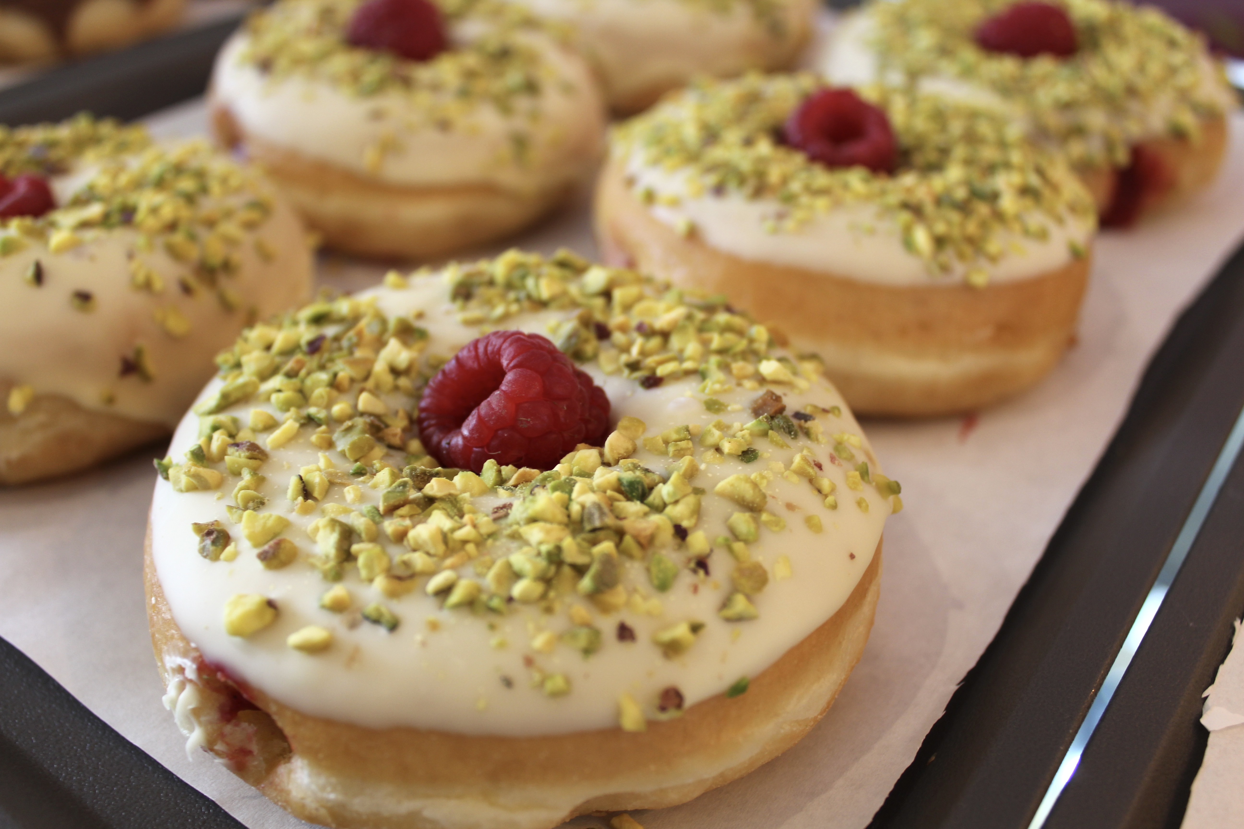 Donut framboise & pistache: nappage chocolat blanc, framboise, crème fouettée pistache, fourré coulis framboise
