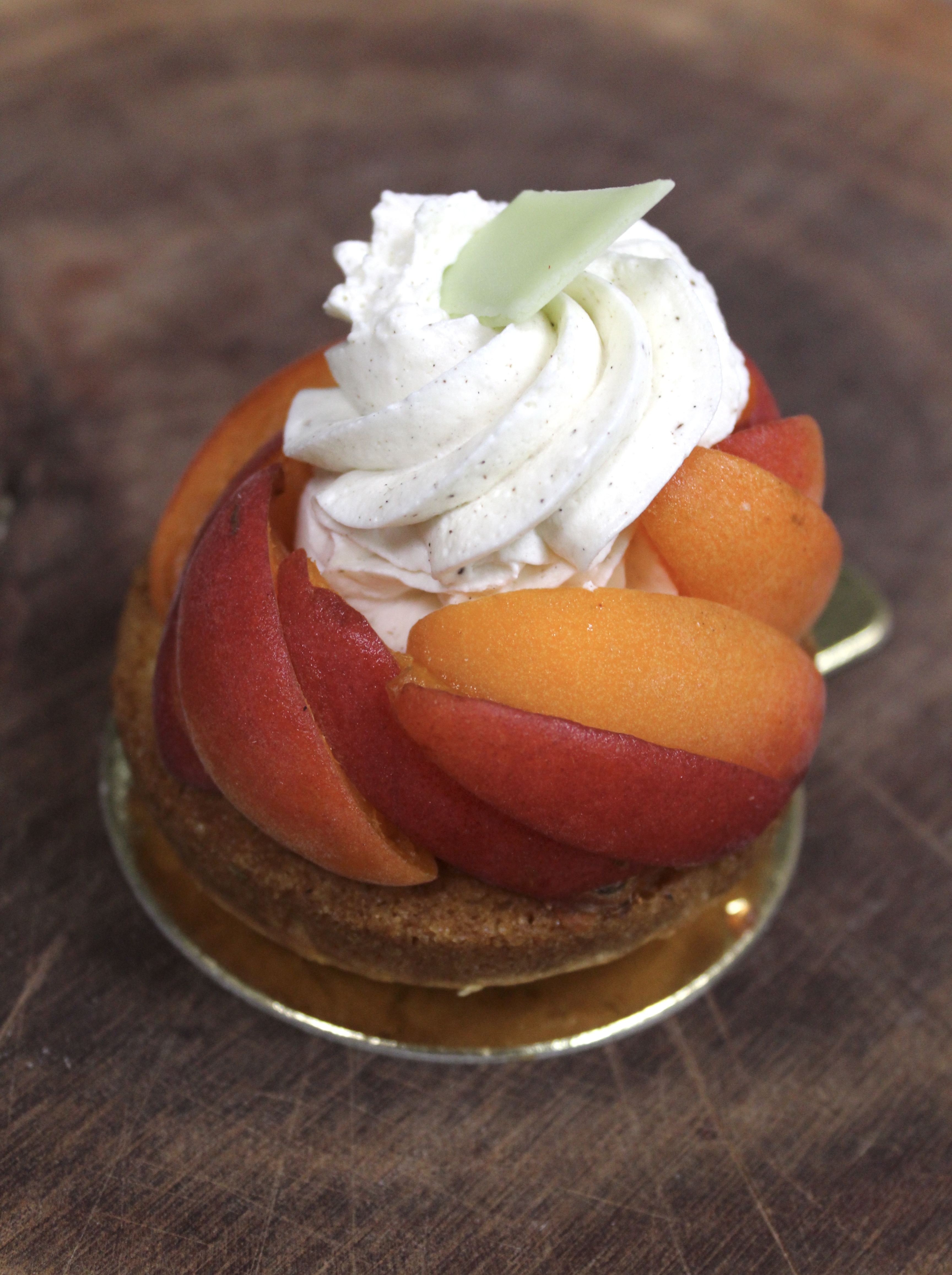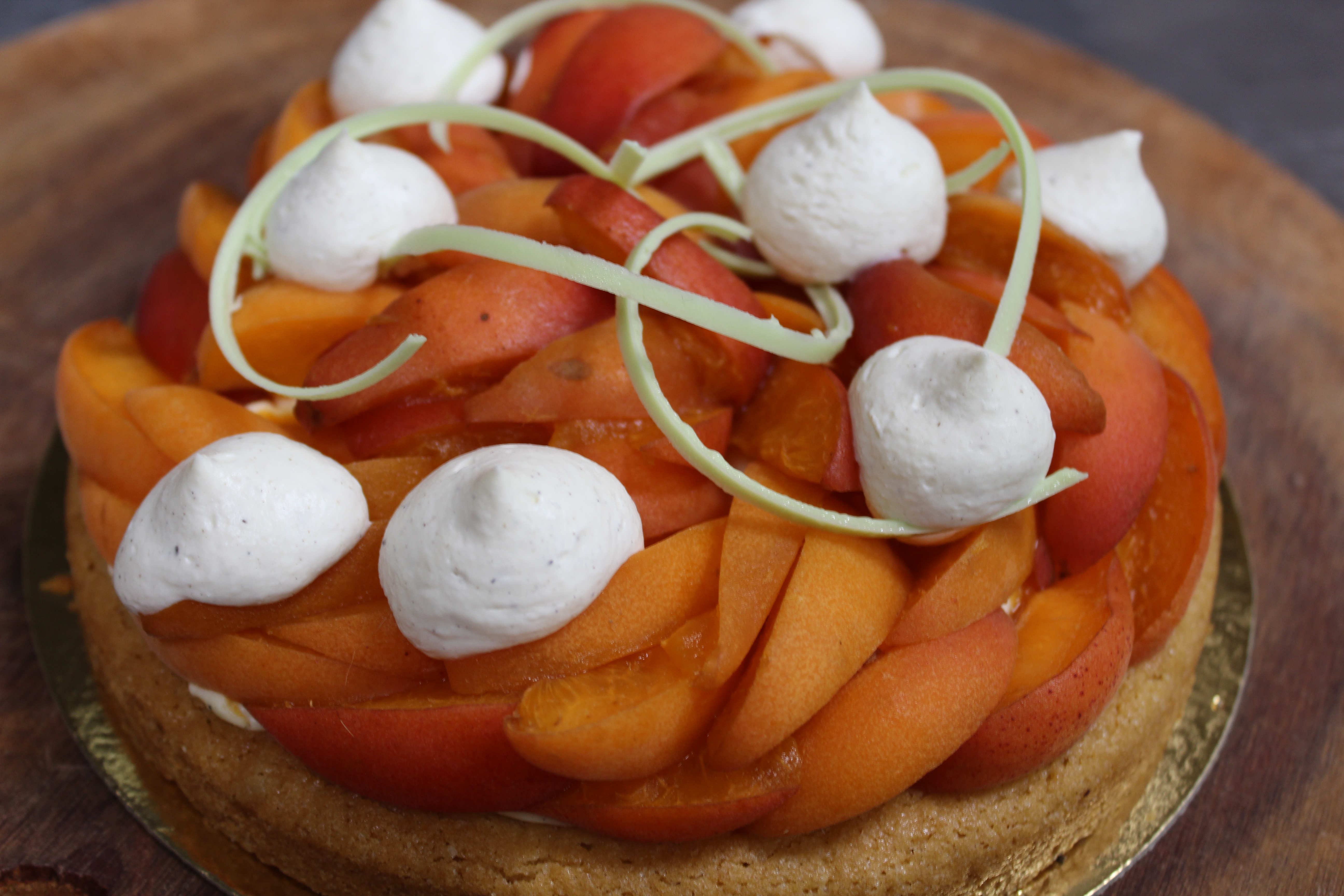 Sablé Breton, crème légère vanille, confit abricot, abricot confiture frais, pointe de chantilly, déco choco vert