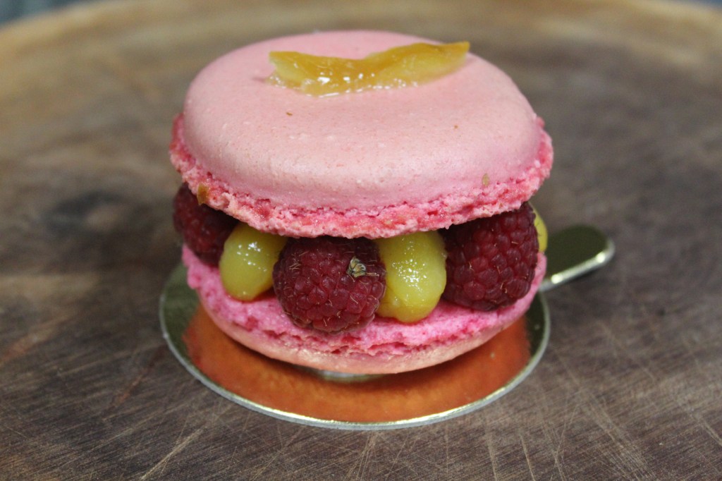 Crémeux citron, framboises fraiches, coque de macaron