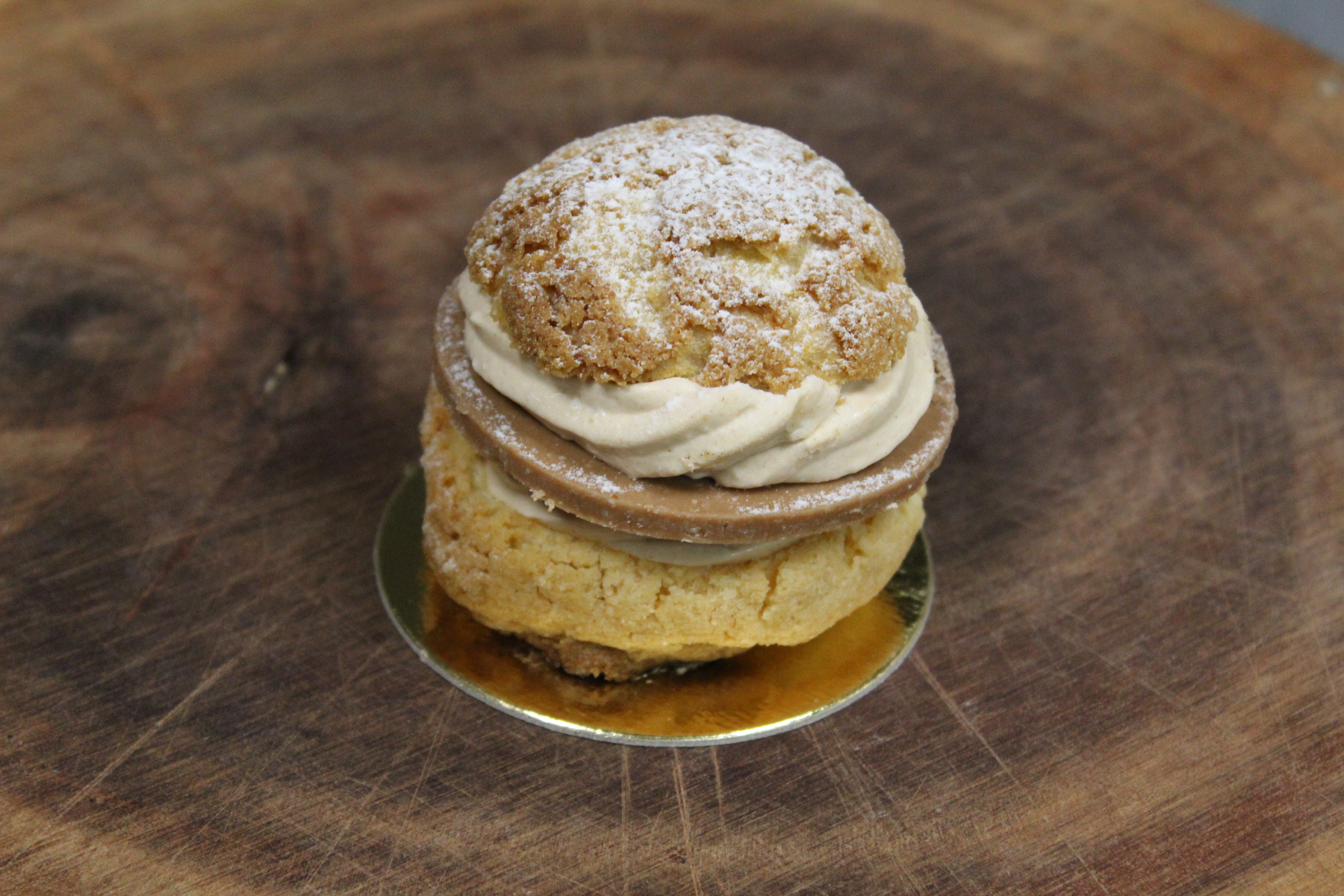 Pâte à choux craquelin, crème au beurre allégée, praliné fruité amande noisette de la maison Cluizel, insert praliné, coulis praliné