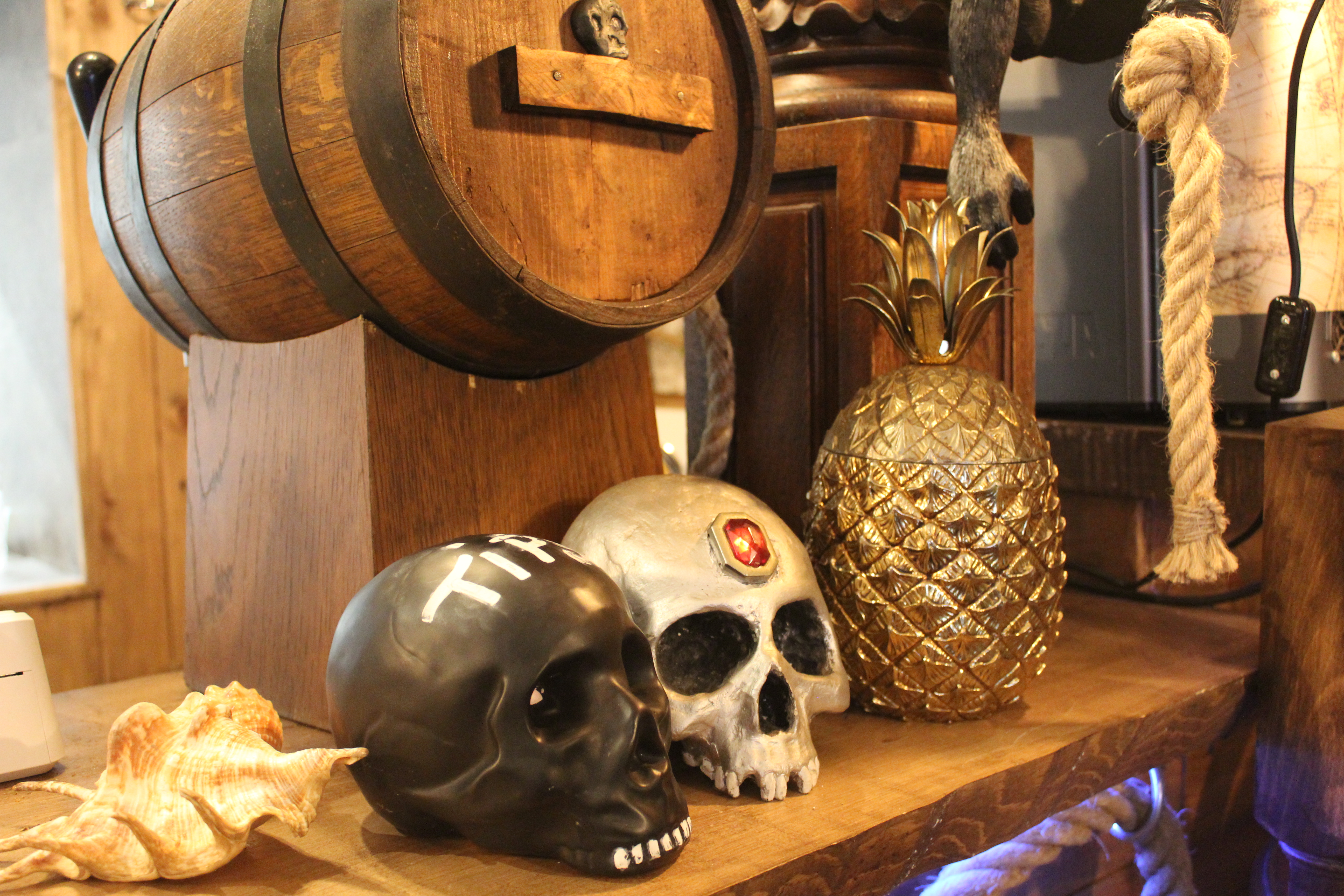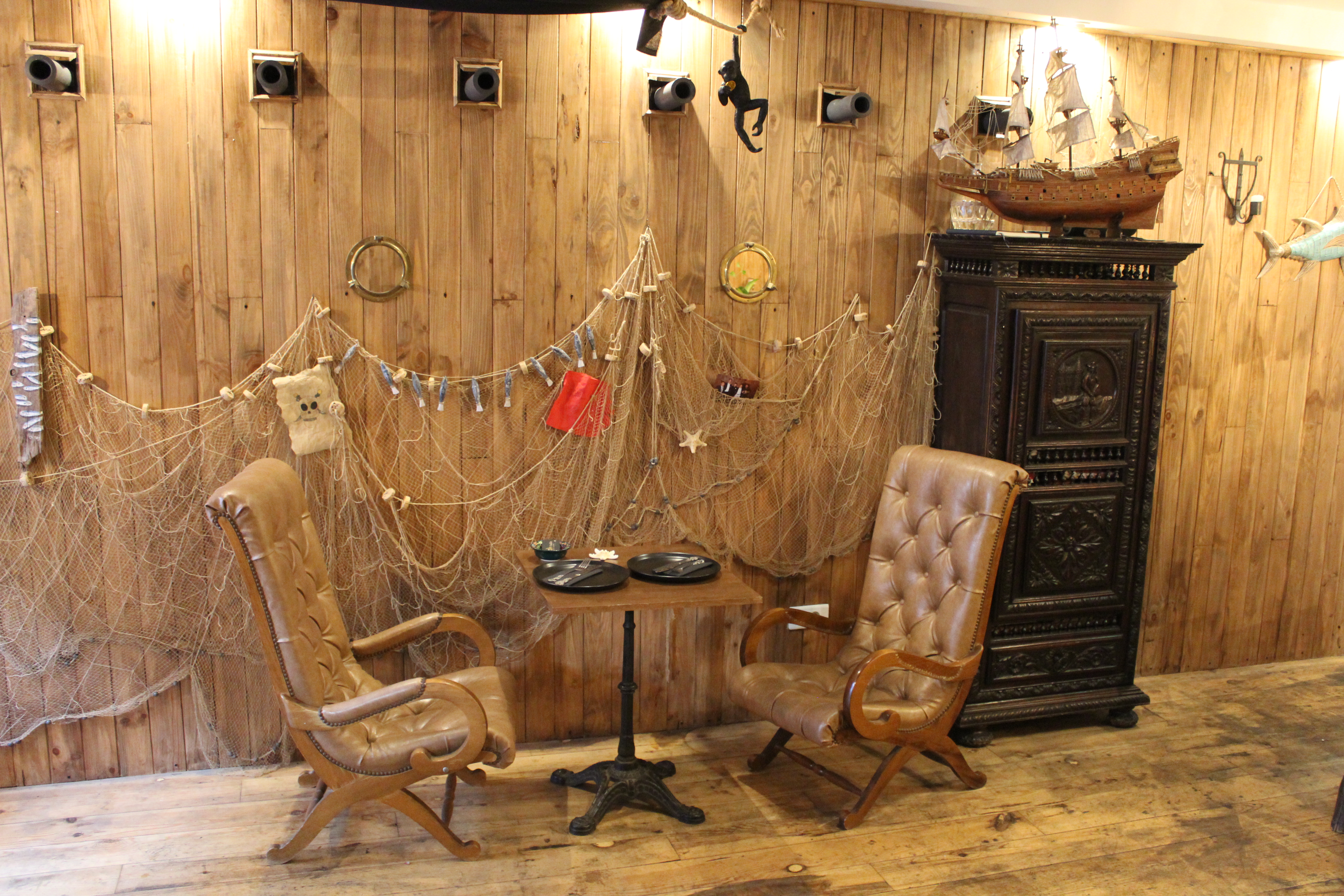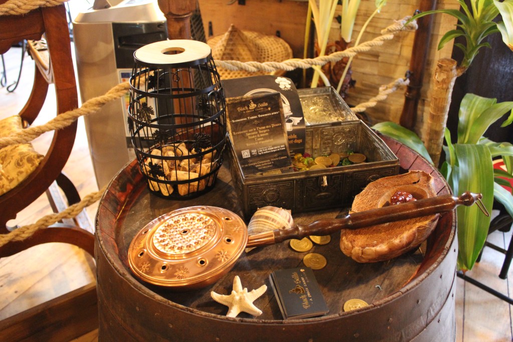 Et c’est très réussi! Dès que l’on arrive, on est plongé dans l’univers des Pirates, une décoration de fou dans les moindres détails, du menu en passant par les couverts, les petits verres à shot, les objets aux murs, aux plafonds et même jusqu’aux toilettes!