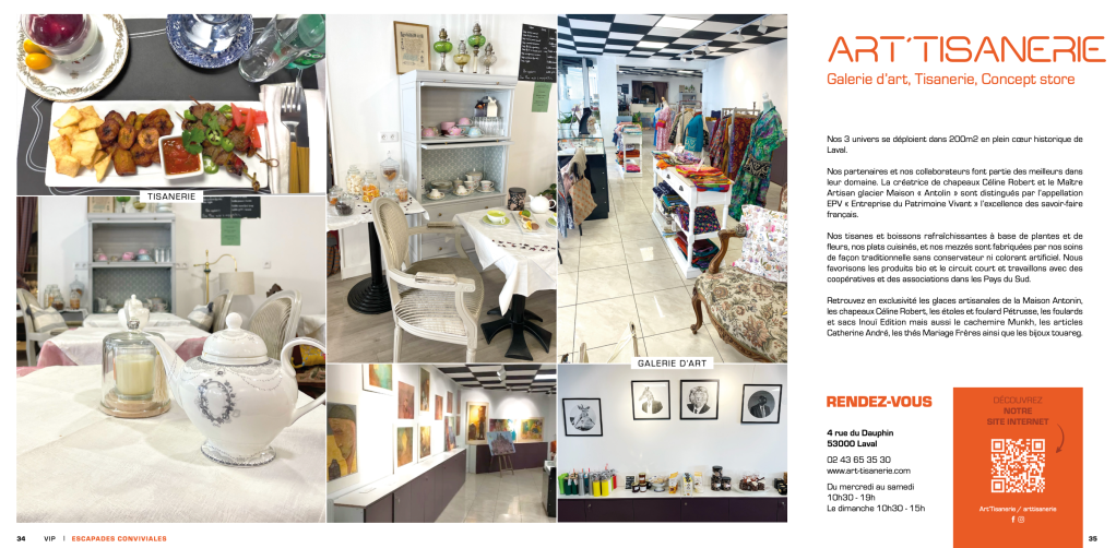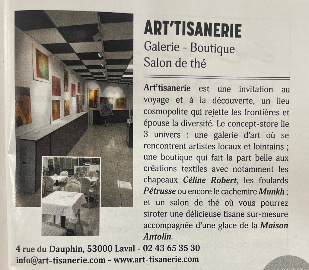 Art’Tisanerie a ouvert ses portes en Janvier 2022. C’est une invitation au voyage, à la découverte, un lieu cosmopolite où trois univers se mélangent: une galerie d’art où vous pouvez découvrir des artistes locaux et d’autres plus lointains, une boutique où l’on trouve des créations textiles, notamment avec les chapeaux de Céline Robert, les foulards Pétrusse, les étoles Inouï Edition (marque Française dont Anne-Marie, gérante du lieu a l’exclusivité sur Laval) ou encore le cachemire Munkh. Et en ce moment, il y a des peintures faites à la main sur de la porcelaine et du verre de l’artiste Paula M.
