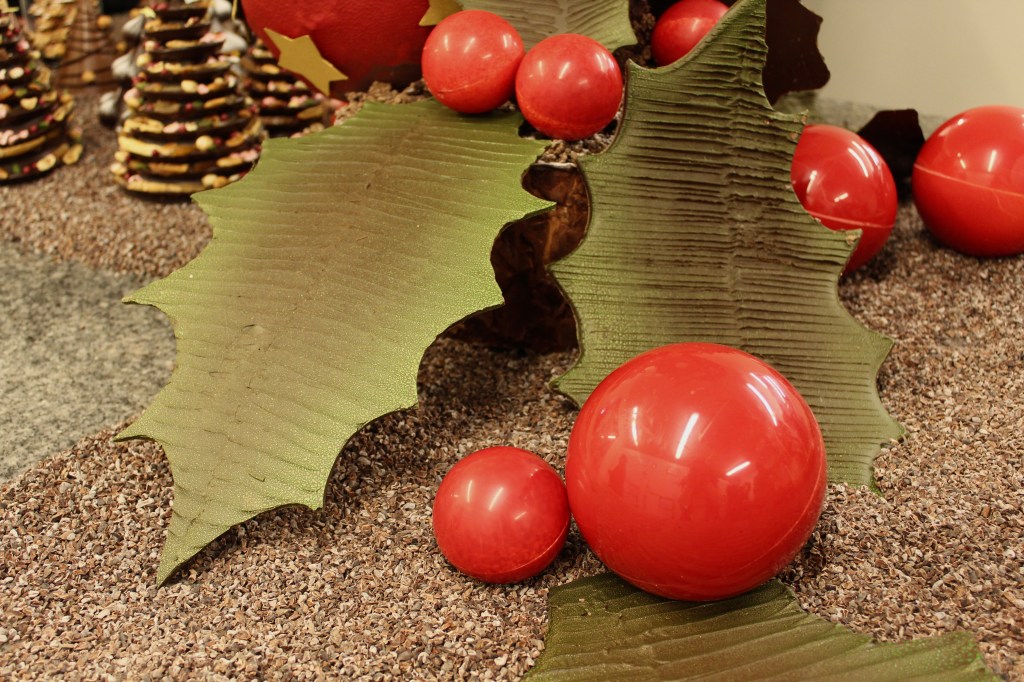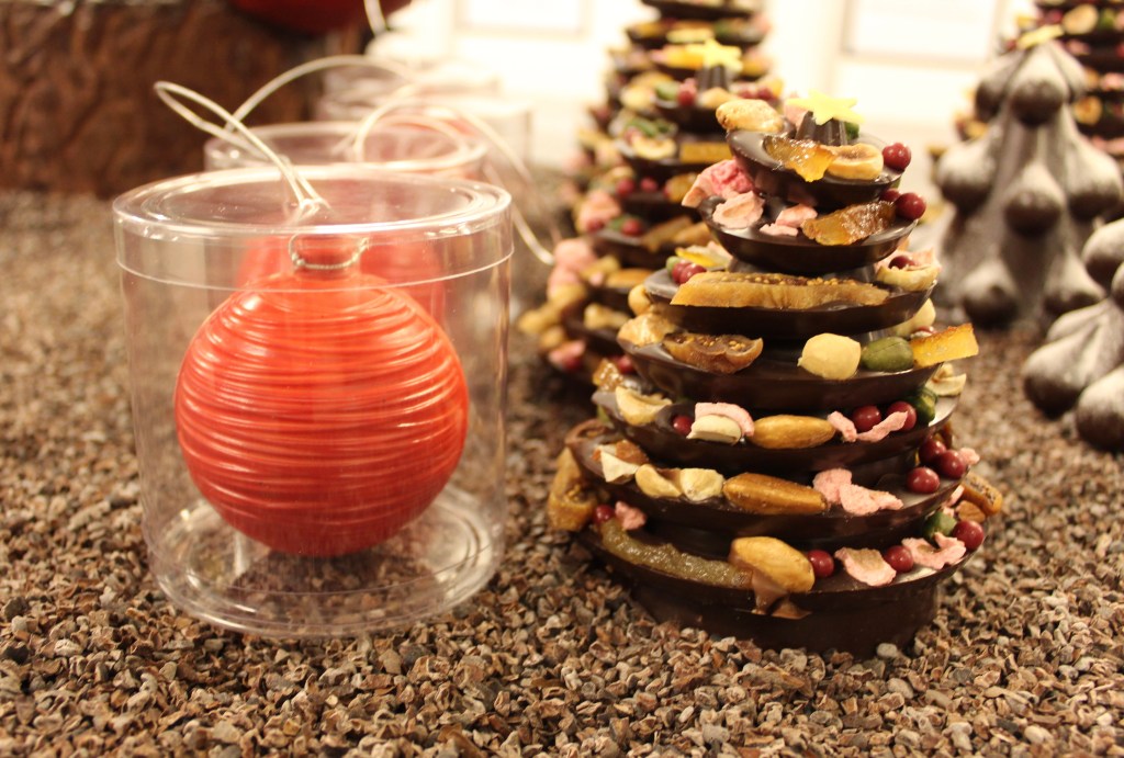 Puis nous avons vu de jolies créations au chocolat: une tête de Père Noël, du houx, des boules de Noël, de jolis sapins, la gamme des tablette de chocolats, et plein d’autres gourmandises, toutes faites en chocolat à 100%, parfois c’est vraiment bluffant!