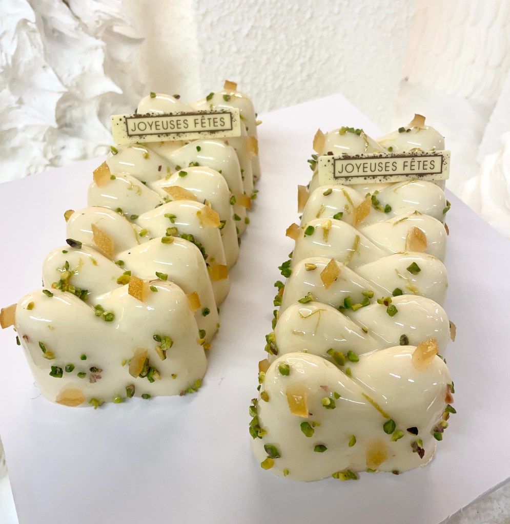 A gauche, il s’agit de la bûche Fraicheur d’Agrumes composée d’une mousse légère citron, d’un biscuit moelleux citron sans farine et d’un croustillant yuzu.