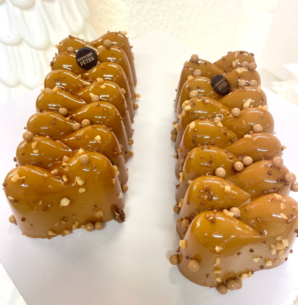 A droite, vous avez la bûche Caramel-Tatin composée d’une mousse caramel, de pommes cuies façon tatin, d’un biscuit amande sans gluten et d’un croustillant sarazin.