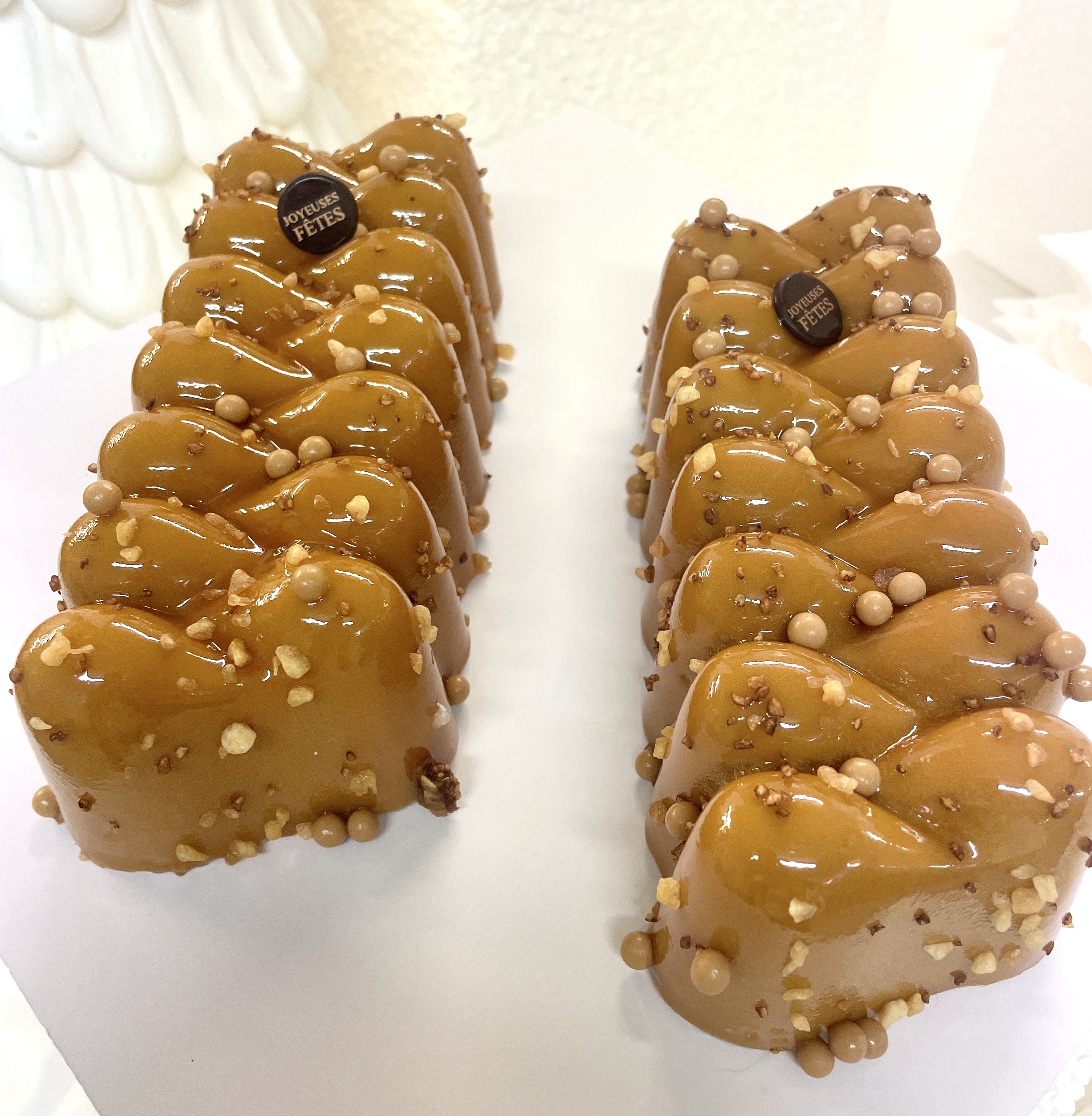 A droite, vous avez la bûche Caramel-Tatin composée d’une mousse caramel, de pommes cuies façon tatin, d’un biscuit amande sans gluten et d’un croustillant sarazin.