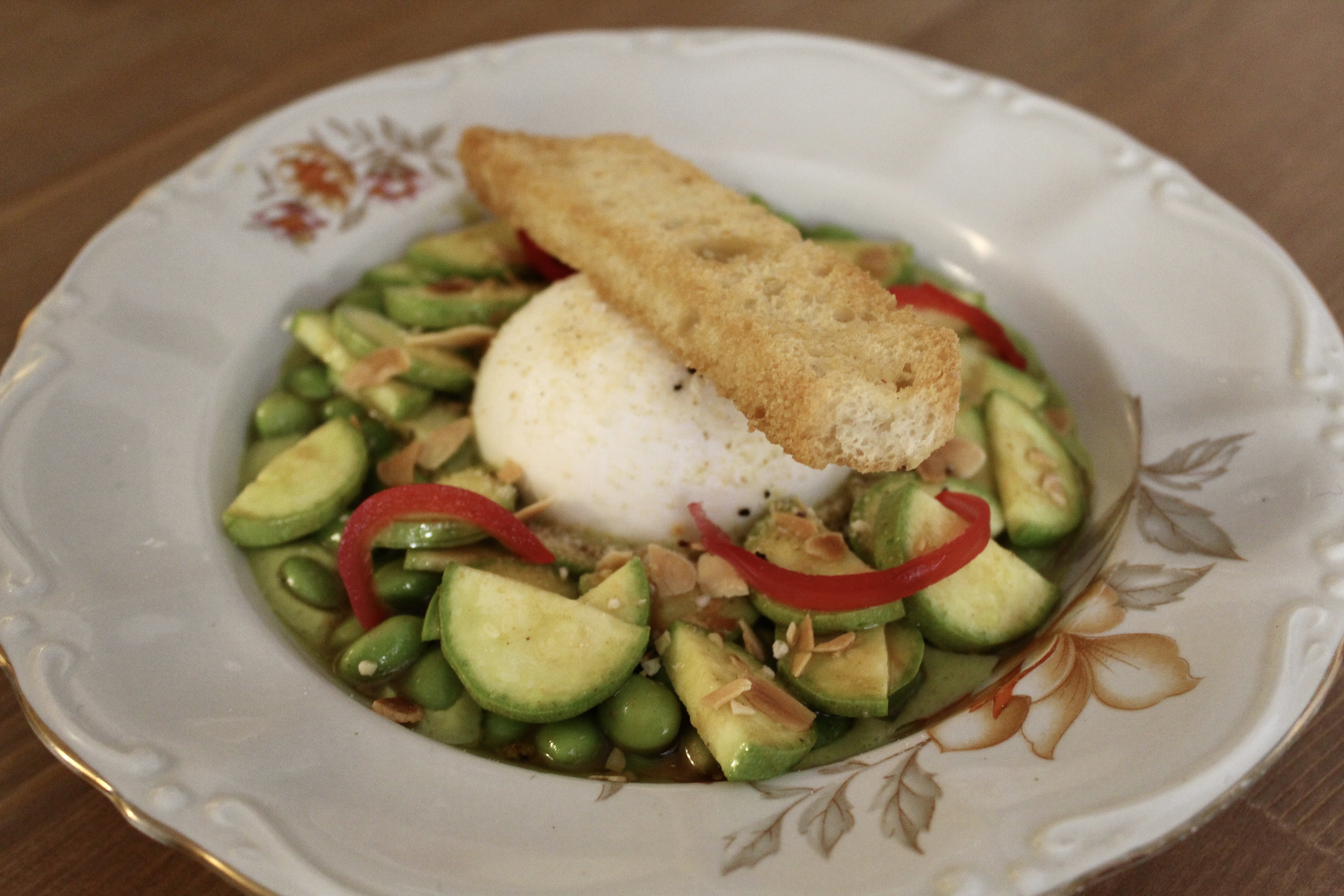 Le Nanard: burrata et sa crème de courgettes curry/ menthe et fèves
