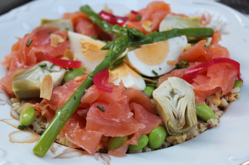 La Simonette: salade de quinoa façon oeuf mimosa, radis, fèves et saumon fumé