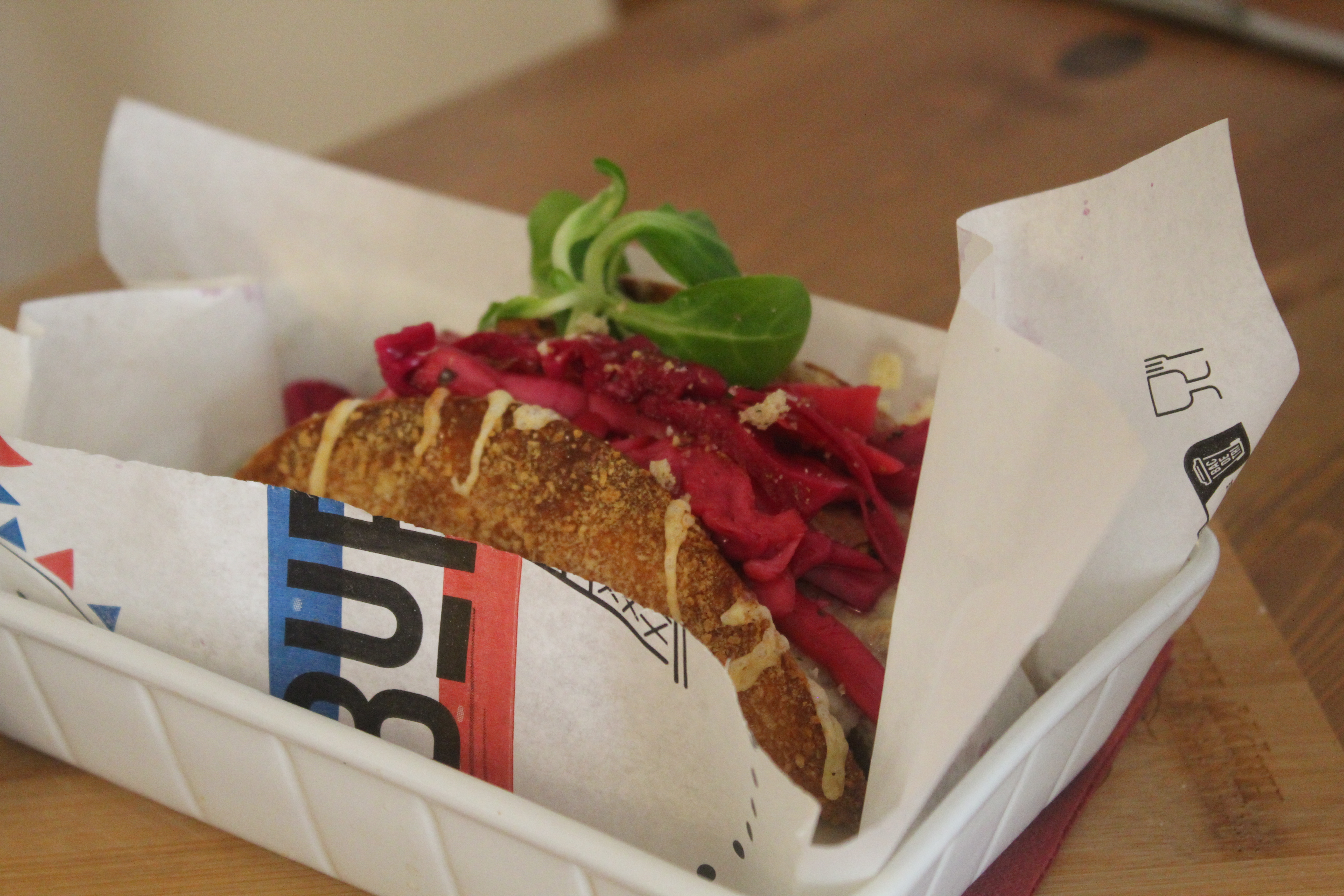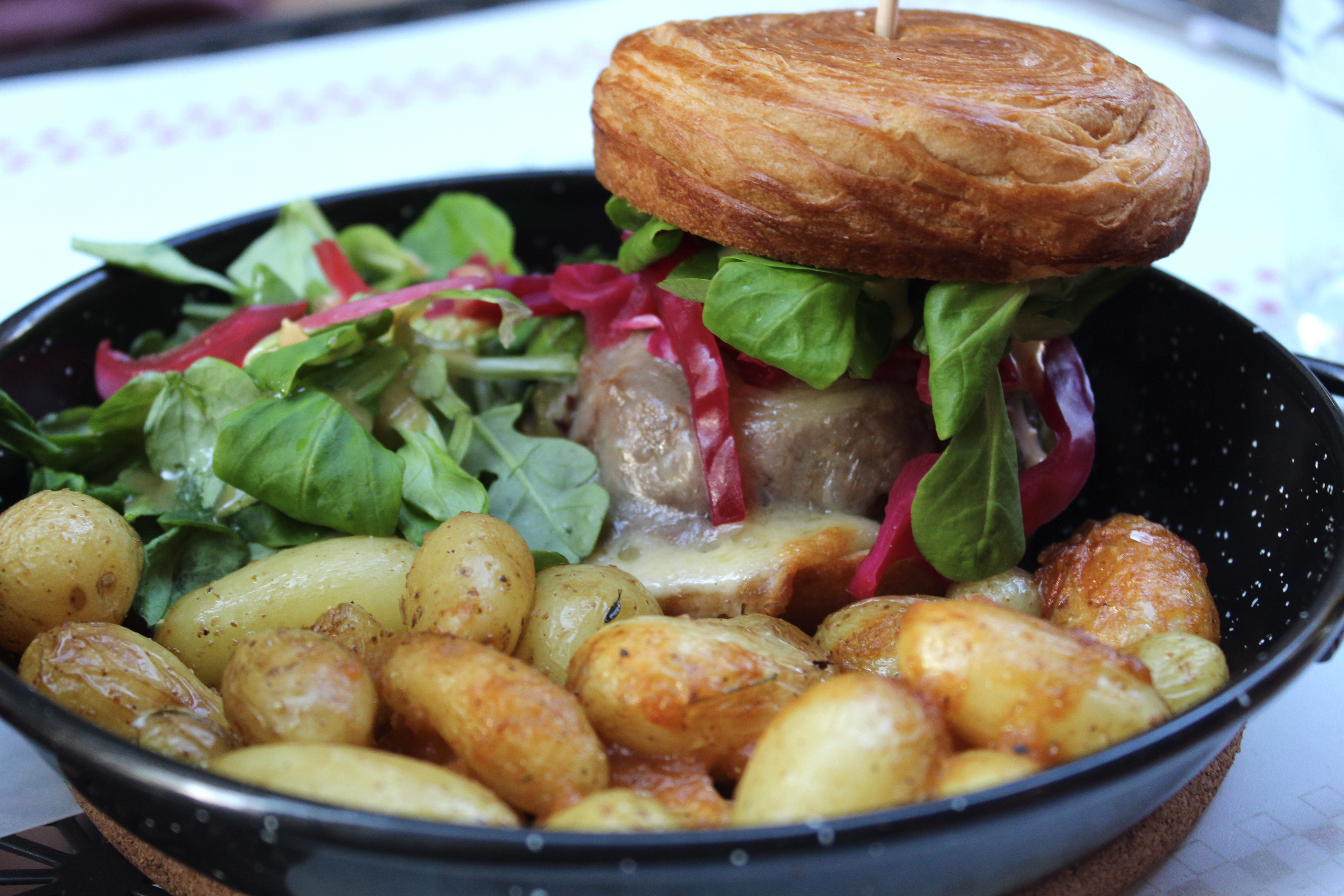 La cuillère pour Mémé: burger d’effiloché de boeuf, comté, confit d’oignons, pickles de choux et jus de viande servi avec des pommes de terre au four