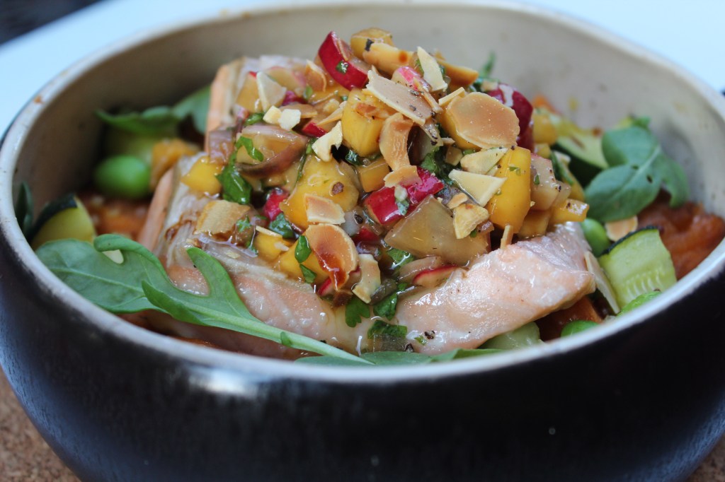 La Marinette: saumon mi-cuit, quinoa, petits légumes et sauce vierge mangue/ coriandre