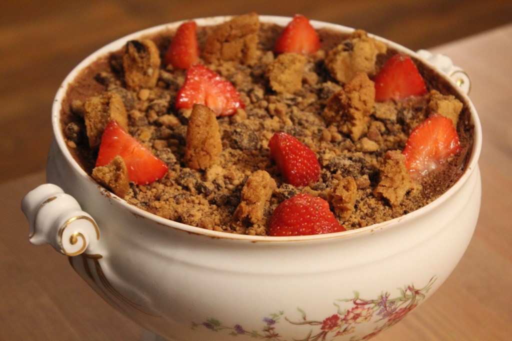Le délice d’Alix: mousse au chocolat (65%), fraises, et morceaux de cookie