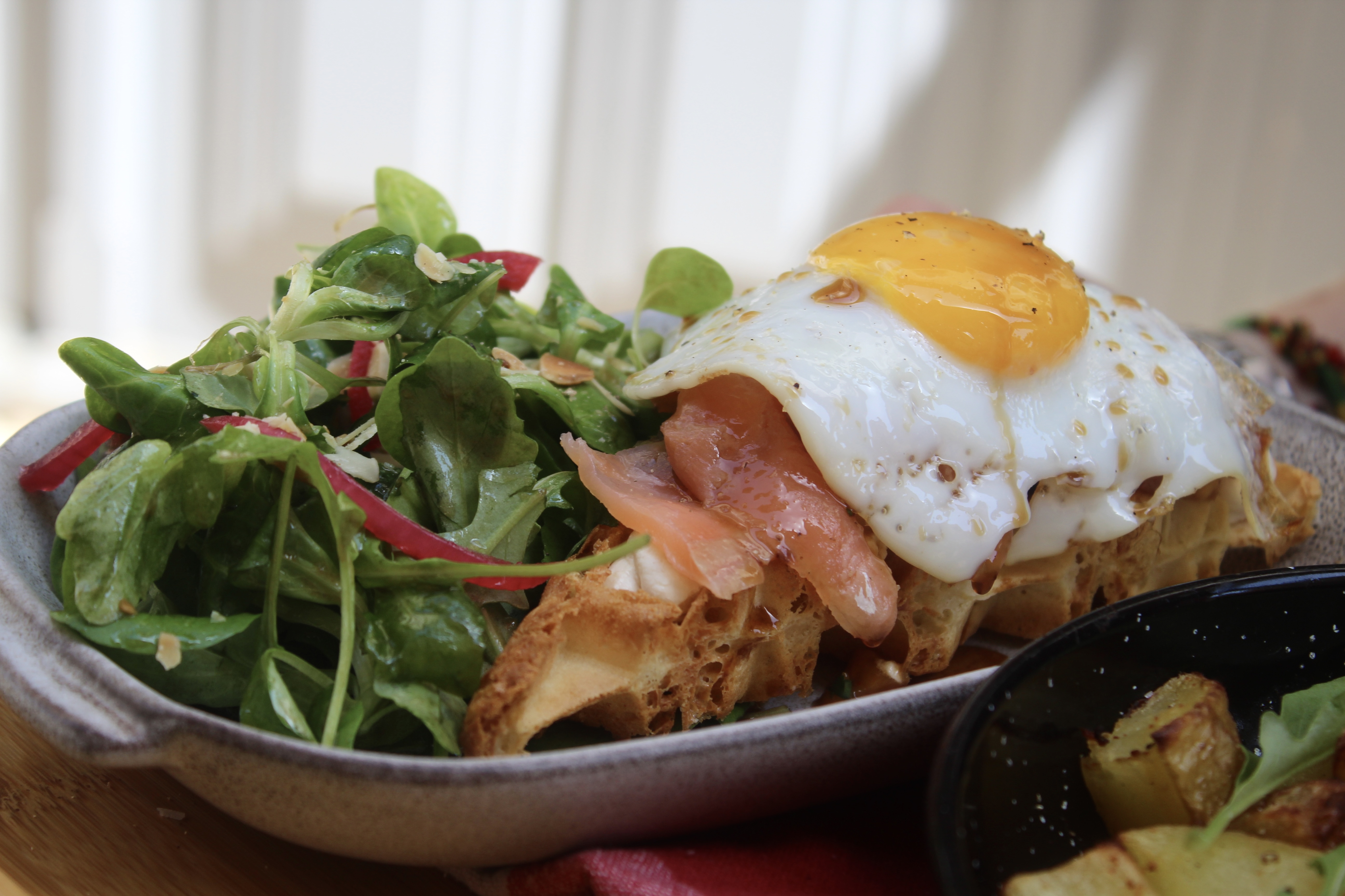 La Pêche de Filou: gaufre saumon, cream cheese au citron, condiment mangue coriandre et oeuf au plat