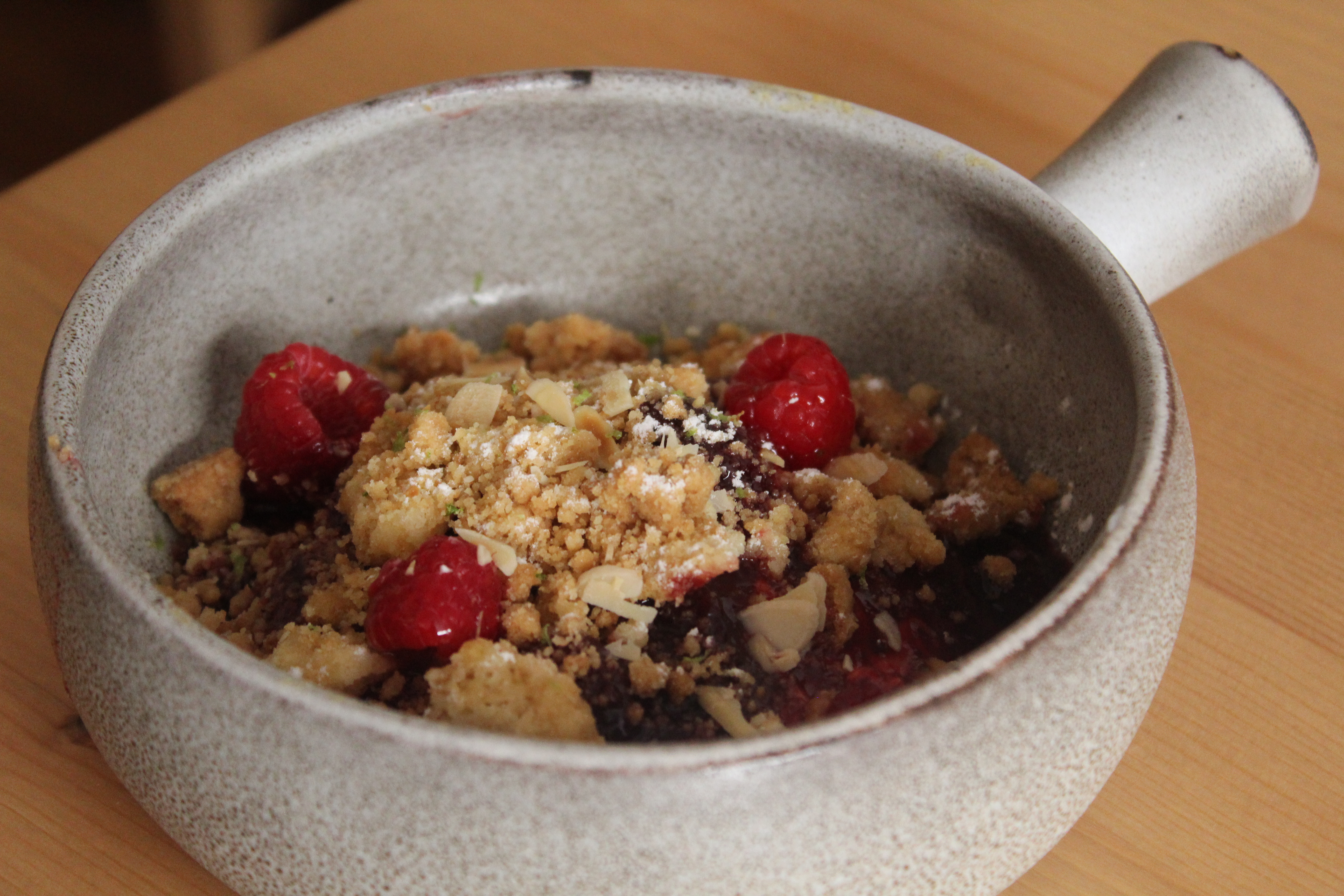 Nanou aux pays des fruits: yaourt Grec, marmelade de framboise et crumble tiède