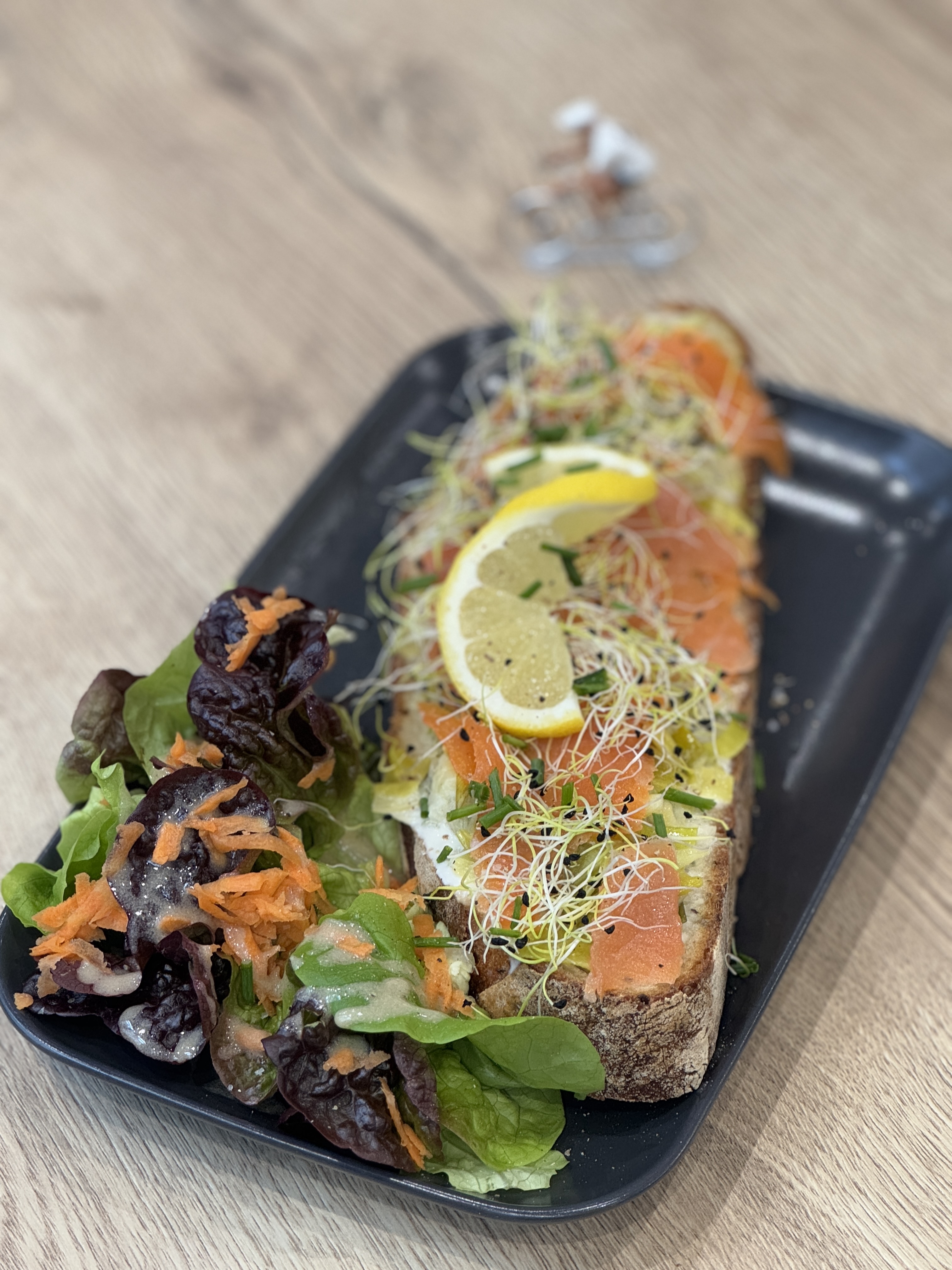 Concernant la partie food, ils essaient de faire une carte à leur image avec des choses qu’ils aiment, gourmandes et saines (étant tous les deux athlètes, c’est un point important pour eux). Celle-ci évolue en fonction des saisons, de leurs envies, avec des plats et ou desserts du jour. Ils proposent des brunchs les jeudis et les samedis car dans la région, il est rare que l’on puisse bruncher un jour de semaine? Dans le brunch, on peut retrouver le fameux avocado toast, le Bagel saumon et sans oublier leurs amis vegan avec le toast Vegan. Ils sont une formule à 25€ avec un choix salé, un dessert, une boisson chaude et un jus de fruits. J’ai goûté le banana bread d’Emy (un régal!)